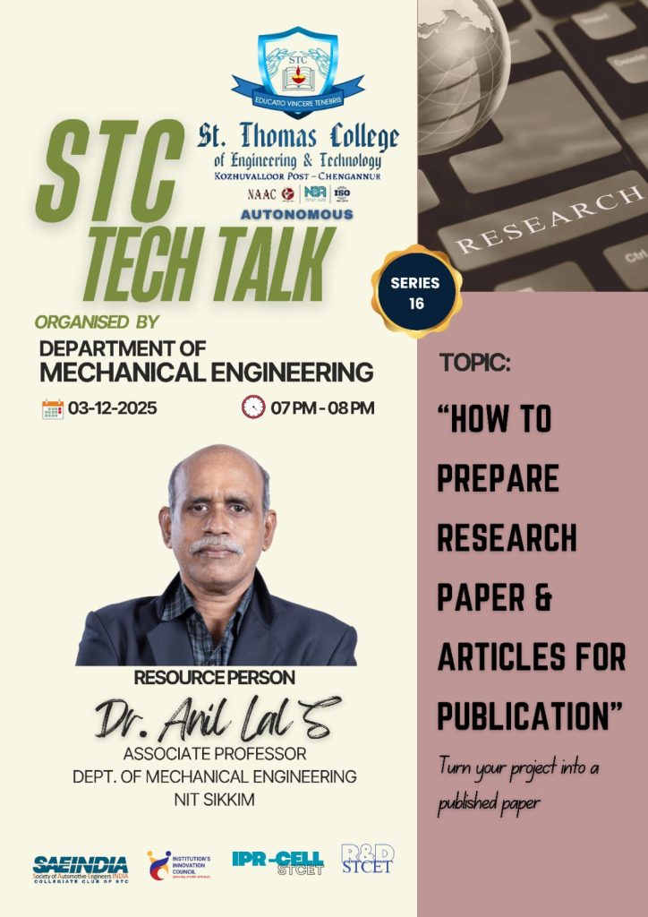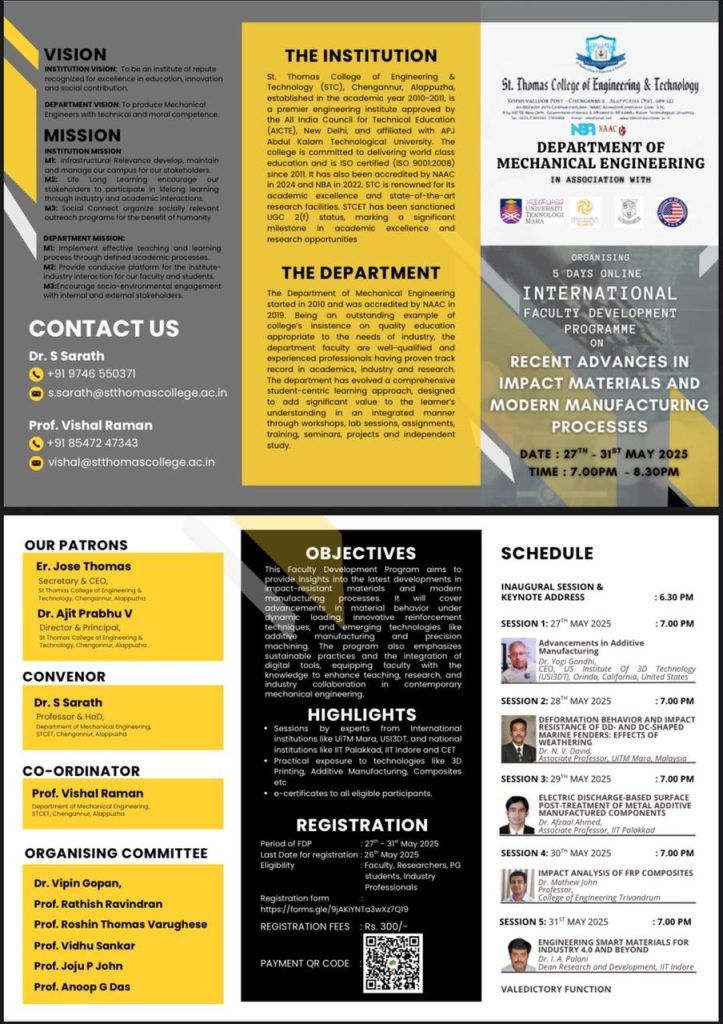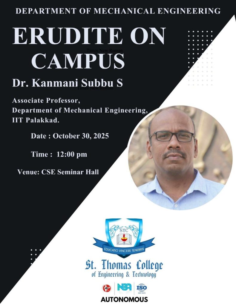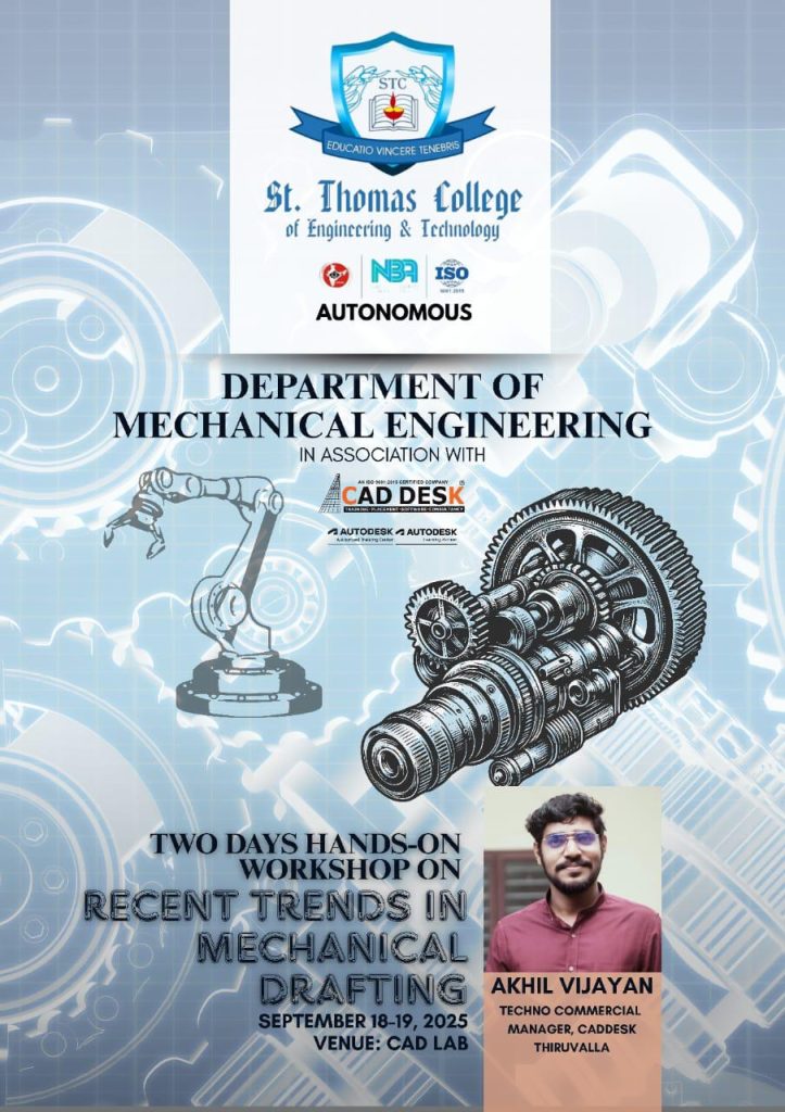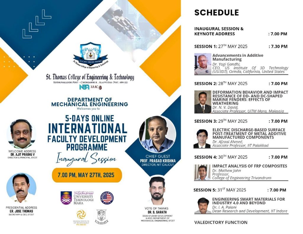 - Resource person for delivering a session on “From Subractive to Additive Manufacturing” at St. Thomas College of Engineering and Technology, Kannur.