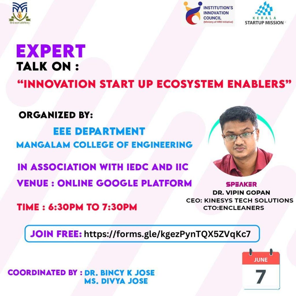 - Resource person for delivering a session on “Innovation and Startup Ecosystem Enablers” at Mangalam College of Engineering, Kottayam.