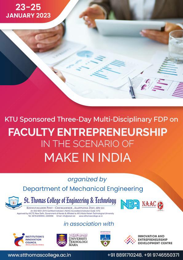 - Resource person for delivering a session on “Journey as a Faculty Entrepreneur” as a part of 3- Day KTU Sponsored FDP on “Faculty Entrepreneurship in the Scenario of Make in India” at St. Thomas College of Engineering and Technology, Alappuzha