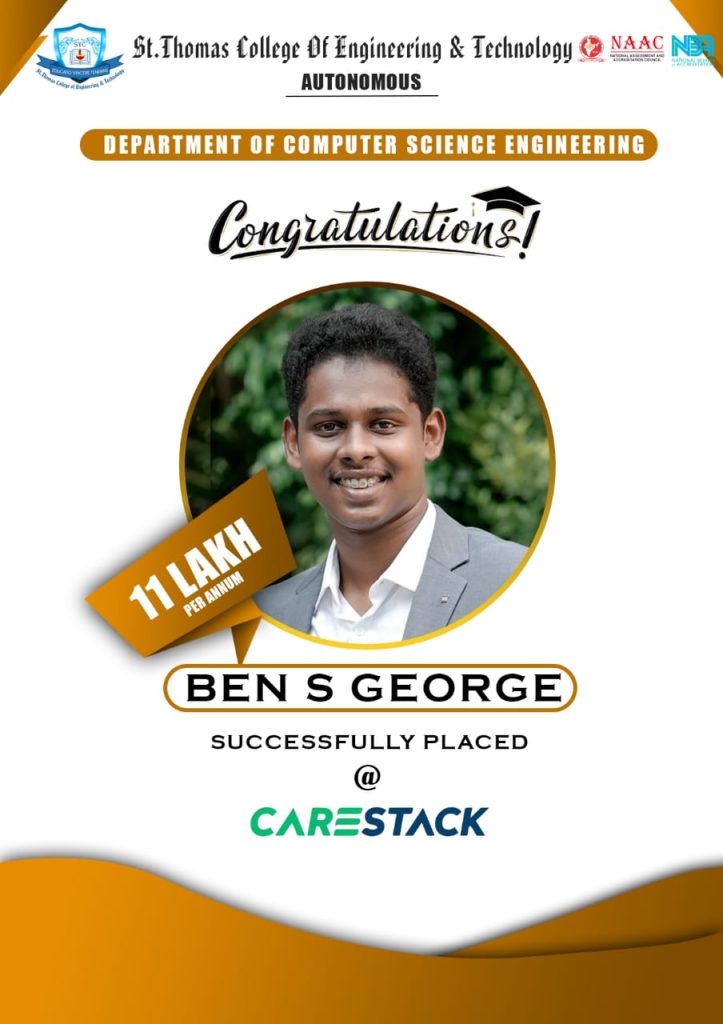 First placement of 2026-Ben S George placed in Carestack (based on internship)- CSE. With a package of 11 Lac. Congratulations